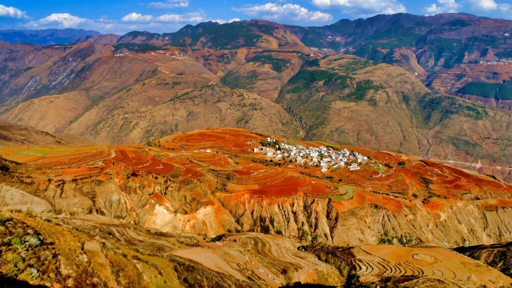 Dongchuan crvena zemlja, oko 250 km sjeveroistočno od Kunminga, poznata je po svojoj upečatljivoj crvenoj zemlji kontrastirajućoj sa zelenim usjevima i zlatnim cvjetovima uljane repice. Tlo bogato mineralima stvara šarena mozaička polja, posebno živa na izlasku i zalasku sunca. Populярni vidikovci uključuju Luoxiagou (Sunset Valley), Damakan (za izlazak sunca) i Qicai Po (Seven-Color Slope), svi favoriti fotografa.