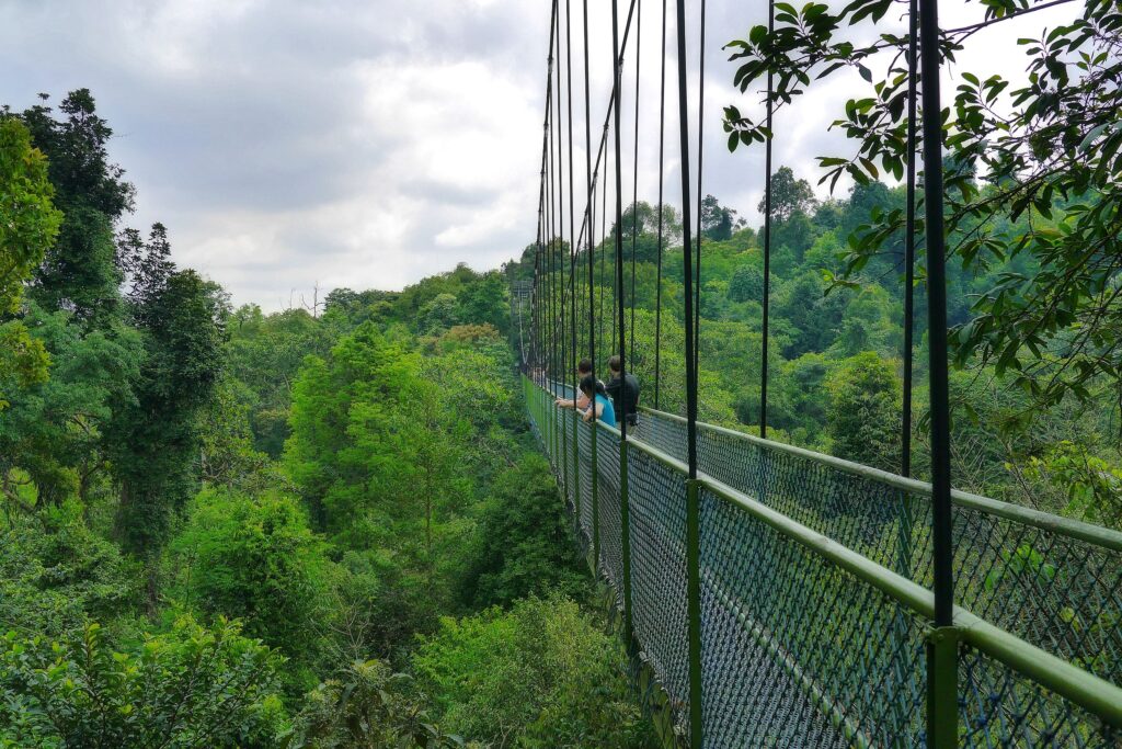 MacRitchie Reservoir Park, le plus ancien réservoir de Singapour, est une échappée favorite pour la randonnée, le jogging et l’observation de la faune à quelques minutes de la ville. Son réseau de 11 km de sentiers forestiers serpente à travers la forêt secondaire tropicale, abritant des macaques à longue queue, des varans, des martins-pêcheurs et même des loutres le long du bord de l’eau. Le point culminant du parc est le TreeTop Walk, un pont suspendu de 250 mètres reliant deux collines et offrant des vues au niveau de la canopée de la forêt – mieux abordé dans le cadre d’une randonnée en boucle de 7 km.