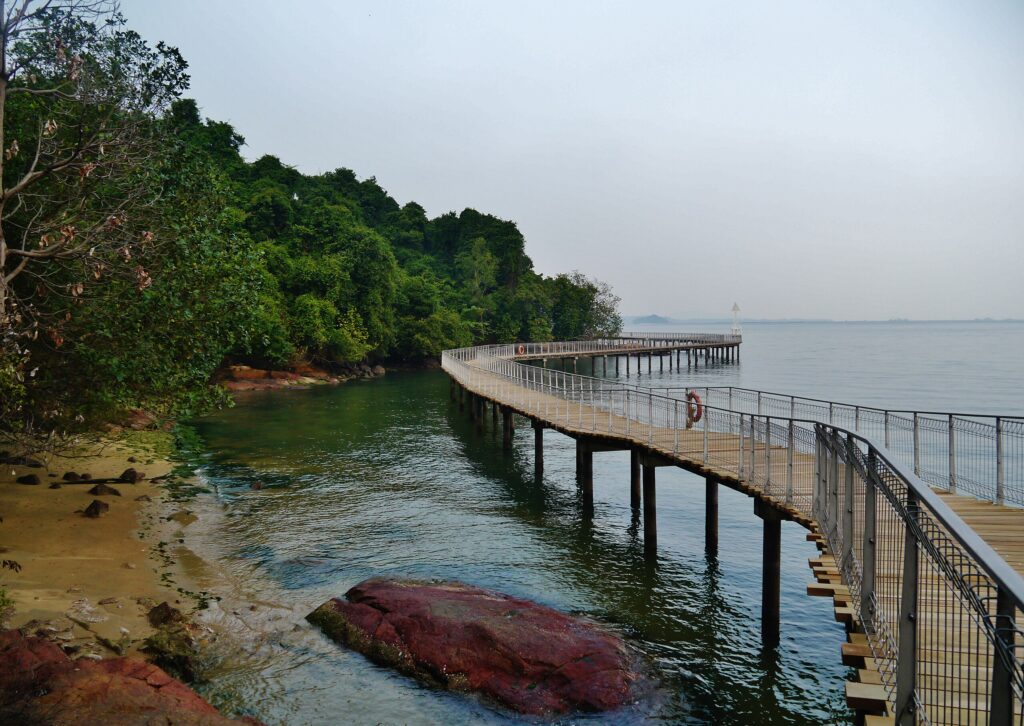 Changi Boardwalk, aussi appelé Changi Point Coastal Walk, est un sentier pittoresque de 2,2 km longeant le littoral nord-est de Singapour. Divisé en sections comme le Sunset Walk, le Kelong Walk et le Cliff Walk, il offre des vues paisibles sur la mer, les kelongs offshore (plateformes de pêche) et même des aperçus de la Malaisie de l’autre côté de l’eau. Il est particulièrement populaire en fin d’après-midi pour les promenades au coucher du soleil, quand le ciel rougeoie sur le détroit de Johor. Le Changi Beach Park à proximité ajoute des aires de pique-nique, des pistes cyclables et une étendue de côte sablonneuse qui semble loin de l’agitation de la ville.