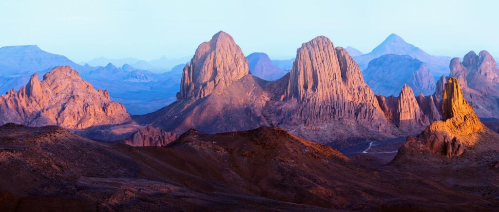 The Hoggar Mountains rise in southern Algeria and are centered around Tamanrasset, which serves as the main access point for travel in the region. The terrain consists of volcanic peaks and open desert valleys, reached by 4×4 routes or guided treks that start from the town. The area is closely linked to Tuareg communities, and some excursions include visits to local camps or villages.