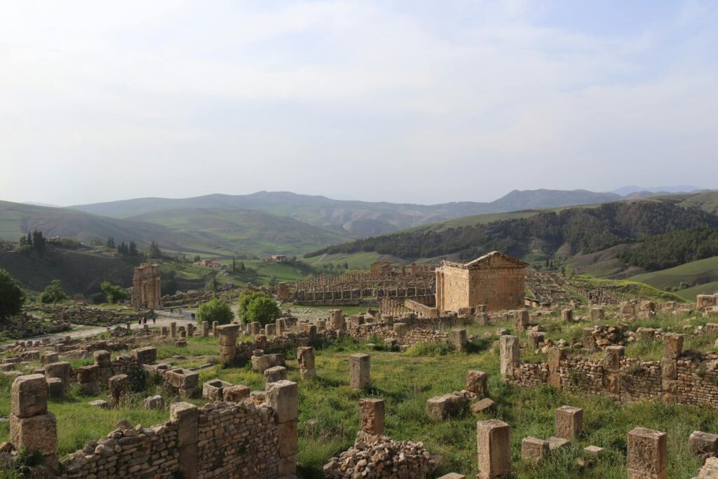 Djemila, known in antiquity as Cuicul, is one of Algeria’s most atmospheric Roman sites thanks to its mountain setting and exceptionally preserved structures. The city sits on a high plateau surrounded by green hills, and its layout adapts to the natural contours of the landscape rather than following a strict grid. Walking through the site takes you past the Forum, baths, residential quarters, and temples that still clearly express the life of a Roman provincial town. The Temple of Septimius Severus stands out for its size and commanding position, offering views across both the ruins and the surrounding valley.