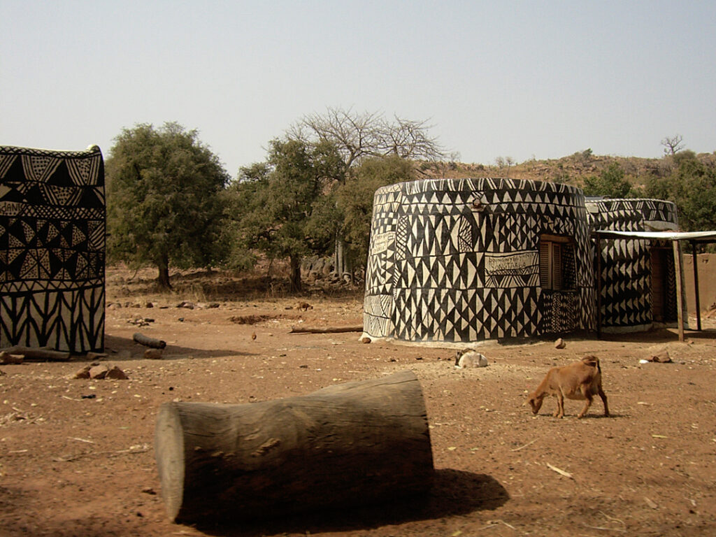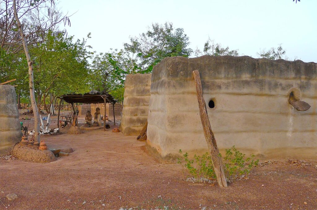 Lobi and Gurunsi villages in southern Burkina Faso provide insight into community structures shaped by animist belief systems, lineage organization, and long-established building traditions. Lobi compounds are typically arranged as enclosed, fortified units built from clay, with separate rooms, storage areas, and internal courtyards that reflect family hierarchy and protective functions. Gurunsi settlements, particularly in Kassena areas near Tiébélé, feature decorated earthen houses maintained by communal effort. Both groups integrate ritual spaces into household layouts, linking daily life with ancestral responsibilities.