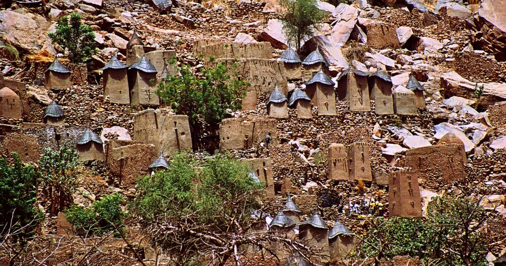 Dogon Country extends along the Bandiagara Escarpment, a long line of cliffs and plateaus where villages are built at the top, base, or on the slopes of the rock face. The region contains ancient cave dwellings attributed to earlier populations and granaries, houses, and meeting structures constructed from stone and mud. This layout reflects Dogon social organization, land use, and long-term adaptation to the environment. Walking routes between villages demonstrate how footpaths connect settlements used for farming, local trade, and community gatherings.