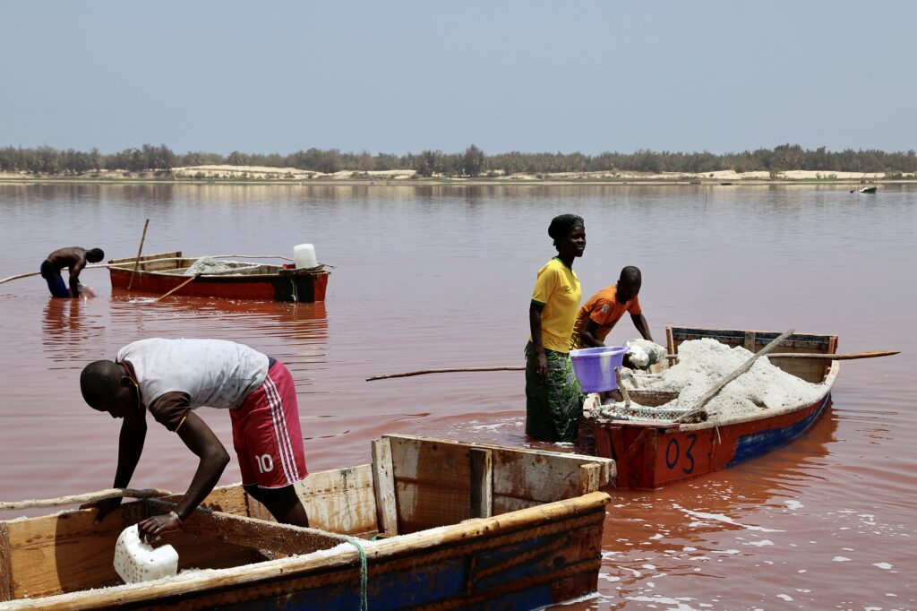 Lake Retba, located northeast of Dakar, is known for the seasonal color of its water, which shifts toward pink during periods of high salinity when certain algae become more visible. The lake is also an active salt-harvesting site. Workers collect crystallized salt from the shallows, and visitors can observe the process or speak with local cooperatives about how the industry operates. The surrounding dunes provide space for quad-bike routes, short camel rides, and walking paths that offer views across both the lake and the nearby coastline.