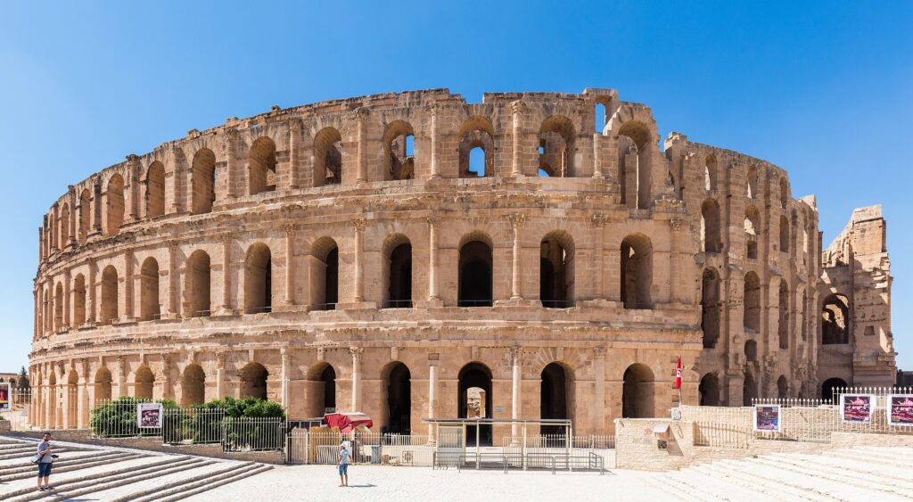El Djem is the site of one of the largest Roman amphitheaters outside Italy, built in the 3rd century to serve a prosperous regional center of the empire. The structure remains almost fully accessible, allowing visitors to move through the arena floor, underground corridors, and upper tiers that overlook the surrounding plains. Its scale shows how Roman administrative and economic networks extended deep into North Africa, and on-site displays explain the role of spectacle and public gatherings in provincial cities.