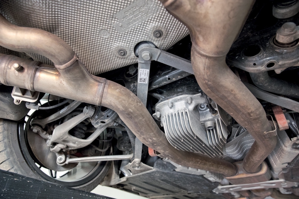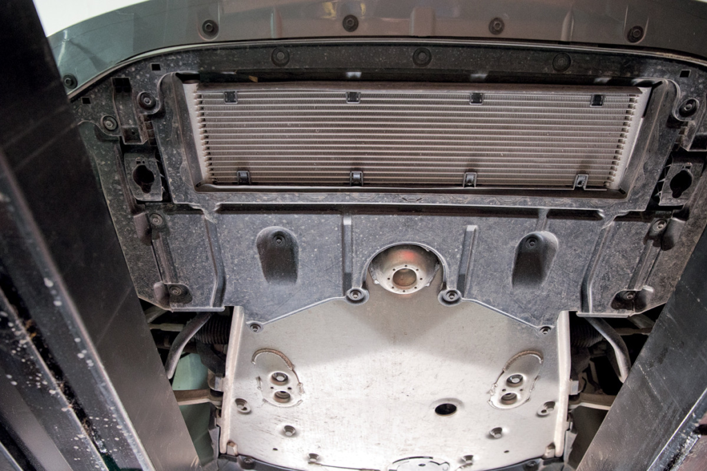 The underbody of any M-Class is a complex of powerful guards and a web of reinforcements. Perhaps this is why the exposed oil cooler seems particularly vulnerable. The rear differential with locking mechanism boasts a surprisingly large finned area.