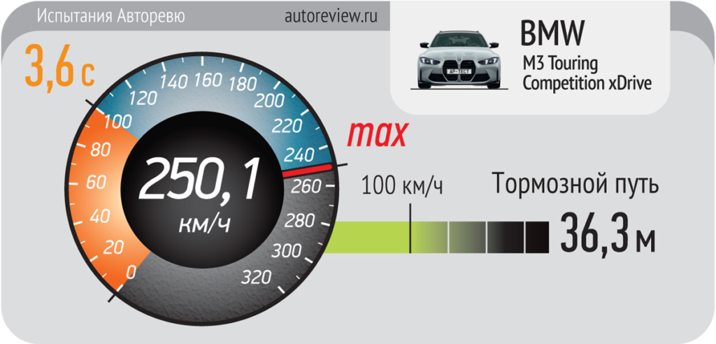 The sprint isn’t accompanied by a memorable engine soundtrack; it’s as if numbers are just running on a screen in a slot machine, and after 21 seconds the M3 Touring literally hits an invisible wall—the limiter cutting in exactly at 250 km/h. The BMW holds a straight line perfectly; acoustic comfort at maximum velocity is almost more pleasant than at seventy, since the aerodynamic noise is moderate and the tire roar is gone.