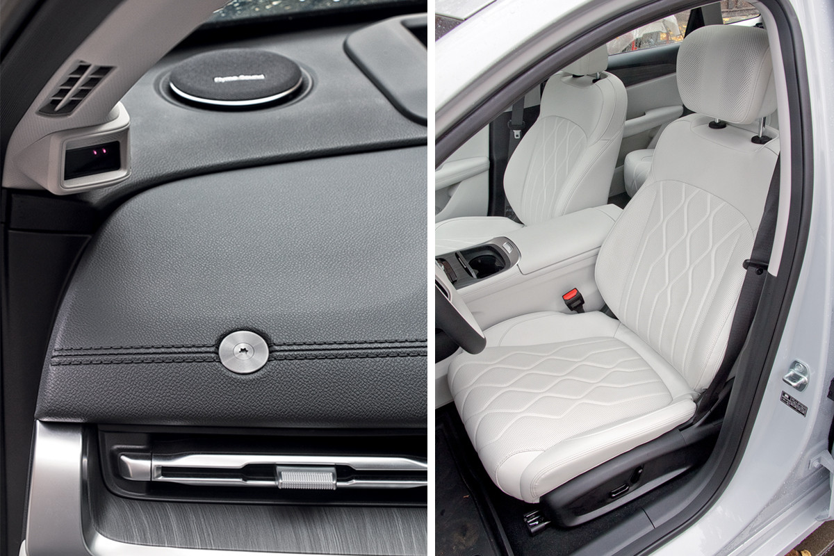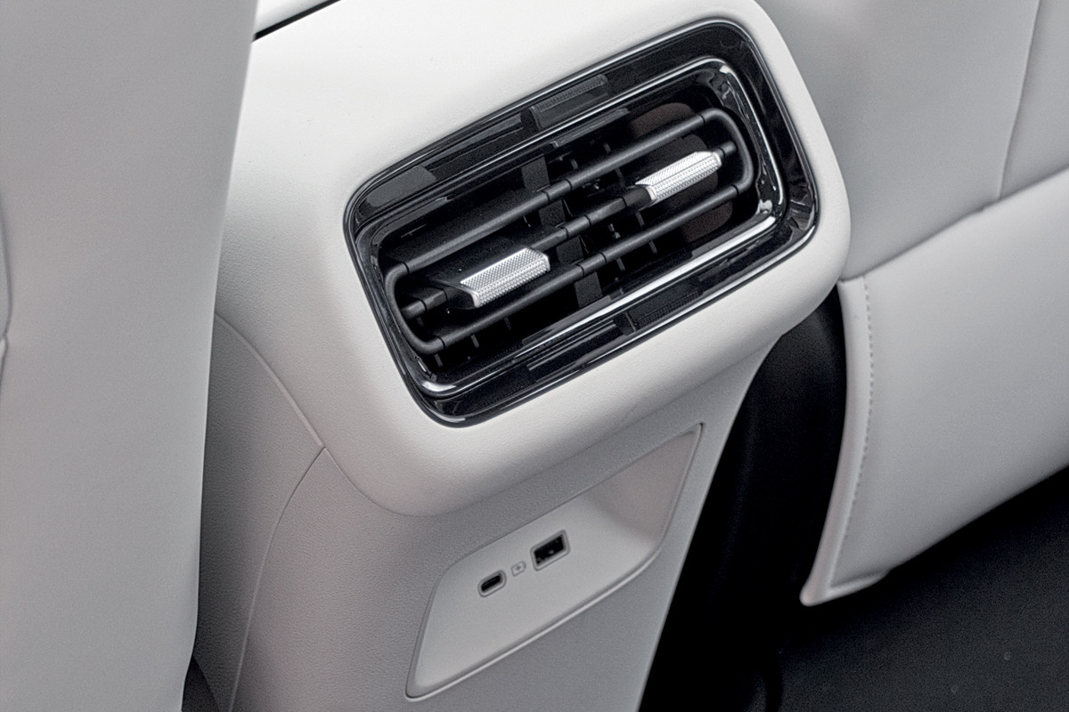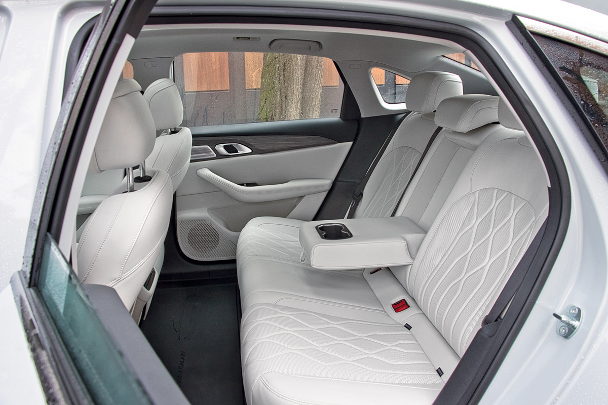 - Rear passengers feel the raised floor from the battery pack most acutely: plenty of shoulder and knee room, but no space to slide your feet under the front seats, and the headroom is tight