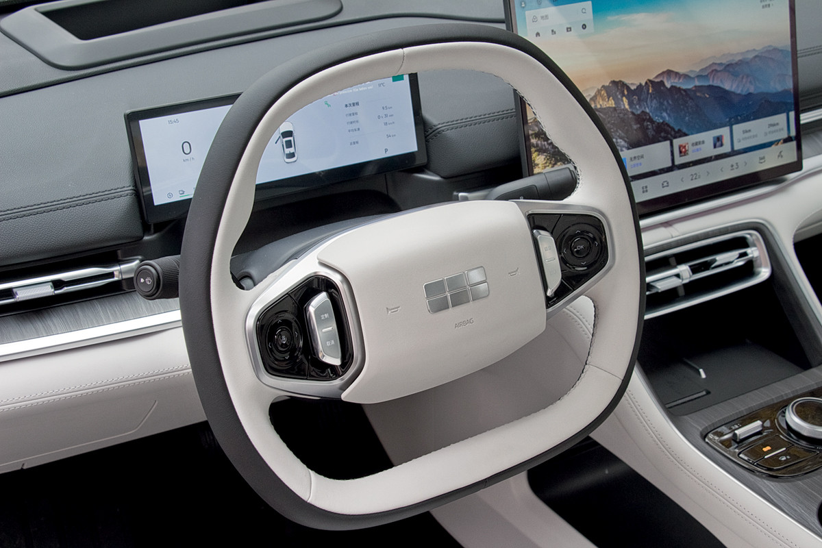 Large sedans haven’t been my thing for years. I’d even trim down my own EV for better agility. But behind the wheel of the Geely A7 — let’s call it a helm rather than a wheel, given this oval oddity — the only thing that bothers me is the low steering sensitivity: three full turns lock-to-lock. That said, the front-wheel steering angle and overall maneuverability are excellent. Parking in tight courtyards is surprisingly effortless, helped by an outstanding 360-degree camera system that stitches together a remarkably seamless bird’s-eye view.