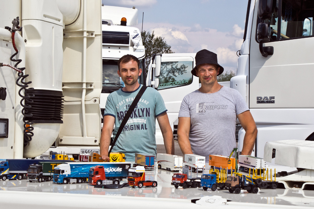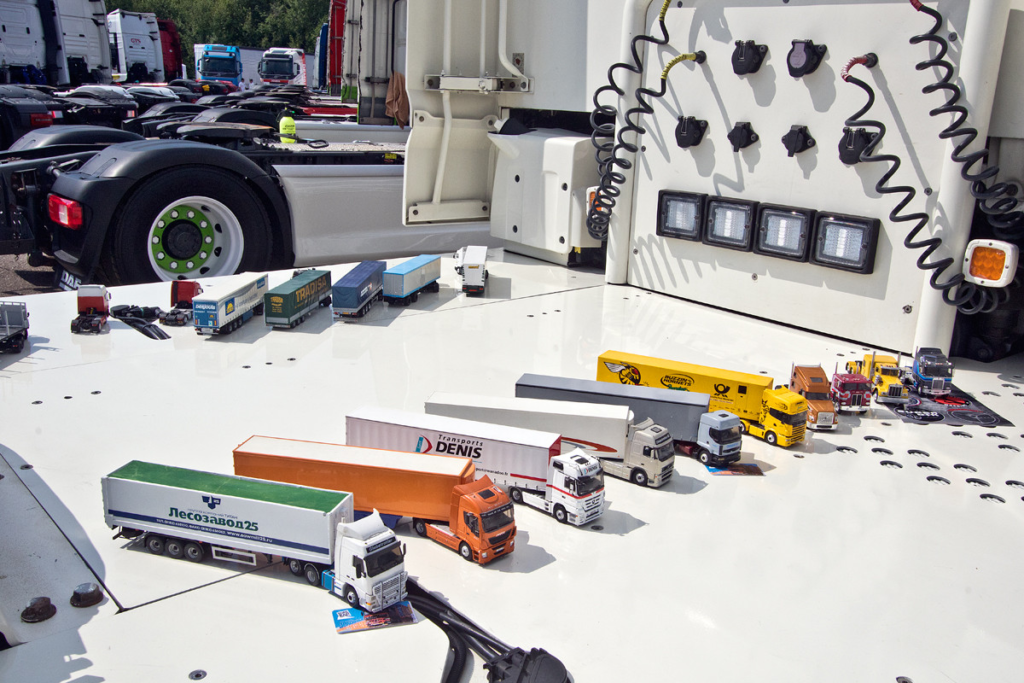 Naturally, there were model trucks for sale too — and not Chinese, but Russian-made 1:43 scale models from Yuri and Vadim of Arkhangelsk. Some were fully original, with 3D-printed cabs, others reworked from donor models. The upgrade lists read like real truck shops: “equipped with a YaMZ-238 engine, opening hood, working rear suspension, and steerable front axle.” For Yuri and Vadim, this is a hobby — one builds ships, the other drives an Iveco Stralis.