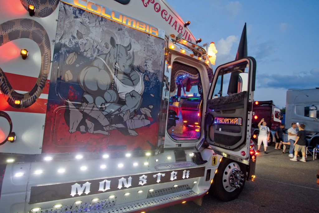 Of course, tuning sometimes veers into kitsch, but even those trucks have fans. Participants joked about one Yaroslavl owner who loaded his aging Freightliner Columbia with every accessory imaginable, belching black smoke and blaring a meowing multi-tone siren. At night, his truck glowed like a carnival ride. Kitsch or not, he won the audience choice award.